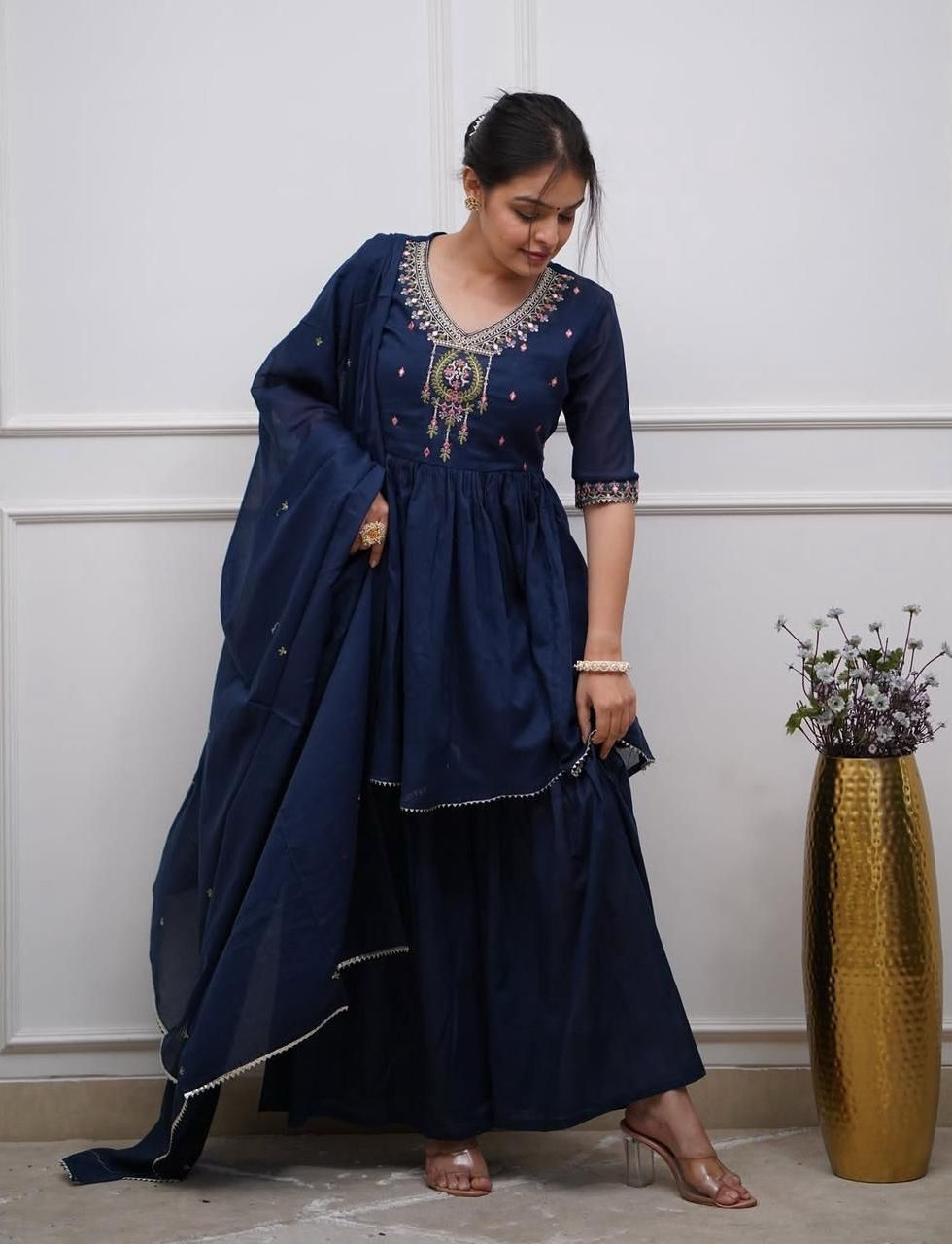 *Cotton 60.60 short Flair Kurti with sharara and dupatta with beautiful colors embroidery work on kurti neck and sleeves with details embroidery & Gota lace work on dupatta also.*✨✨